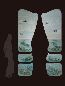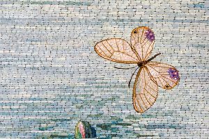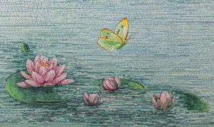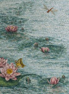 Decorative panel in micromosaic (roman spun micromosaic) depicting a lake landscape. With butterflies, dragonflies, colibri and water lilies. It consists of about 5.000.000 hand spun glass wires (tessere) Dimensions 240x150 cm.