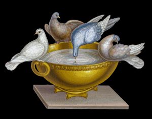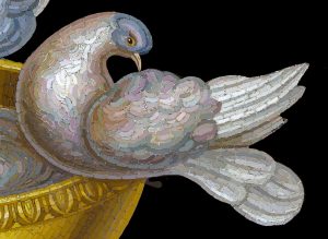 Detail of micromosaic panel, Doves of Pliny, mid 19th century, Roman school. Diameter 30 cm., private collection.