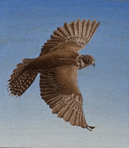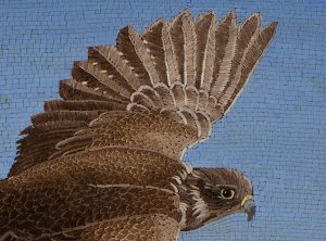 Micromosaic panel "Falcon", created and produced by Kempini in 2012, composed by more than 20.000 hand spun glass wires (mosaico in vitro filato). Dimensions 16,6 cm. x 15,7 cm.